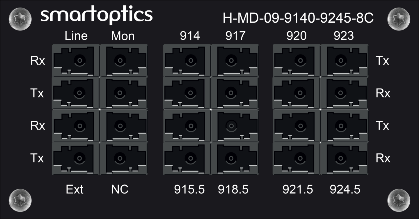 The H-MD-09-xxxx-yyyy-8C filters have two Monitor ports that tap off 1% of the transmitted and received line signal. This provides the ability to monitor the channel power levels via a connected Optical Channel Monitoring (OCM) device or an optical spectrum analyzer.